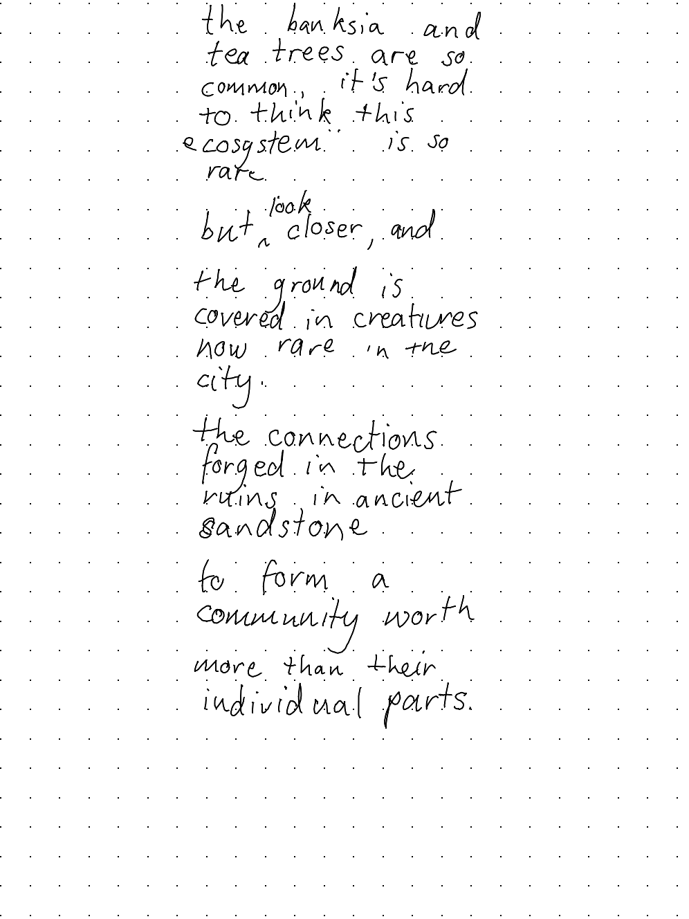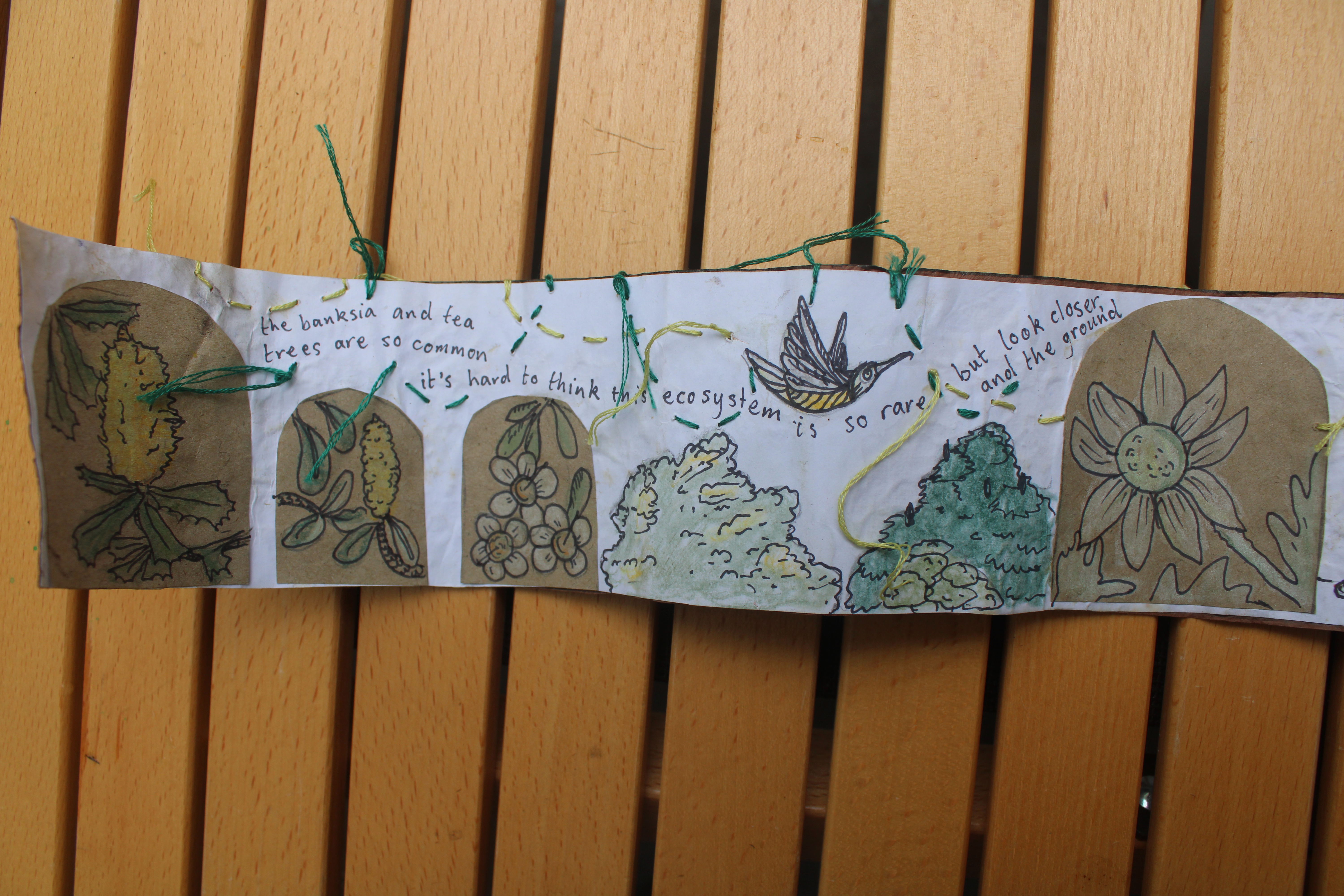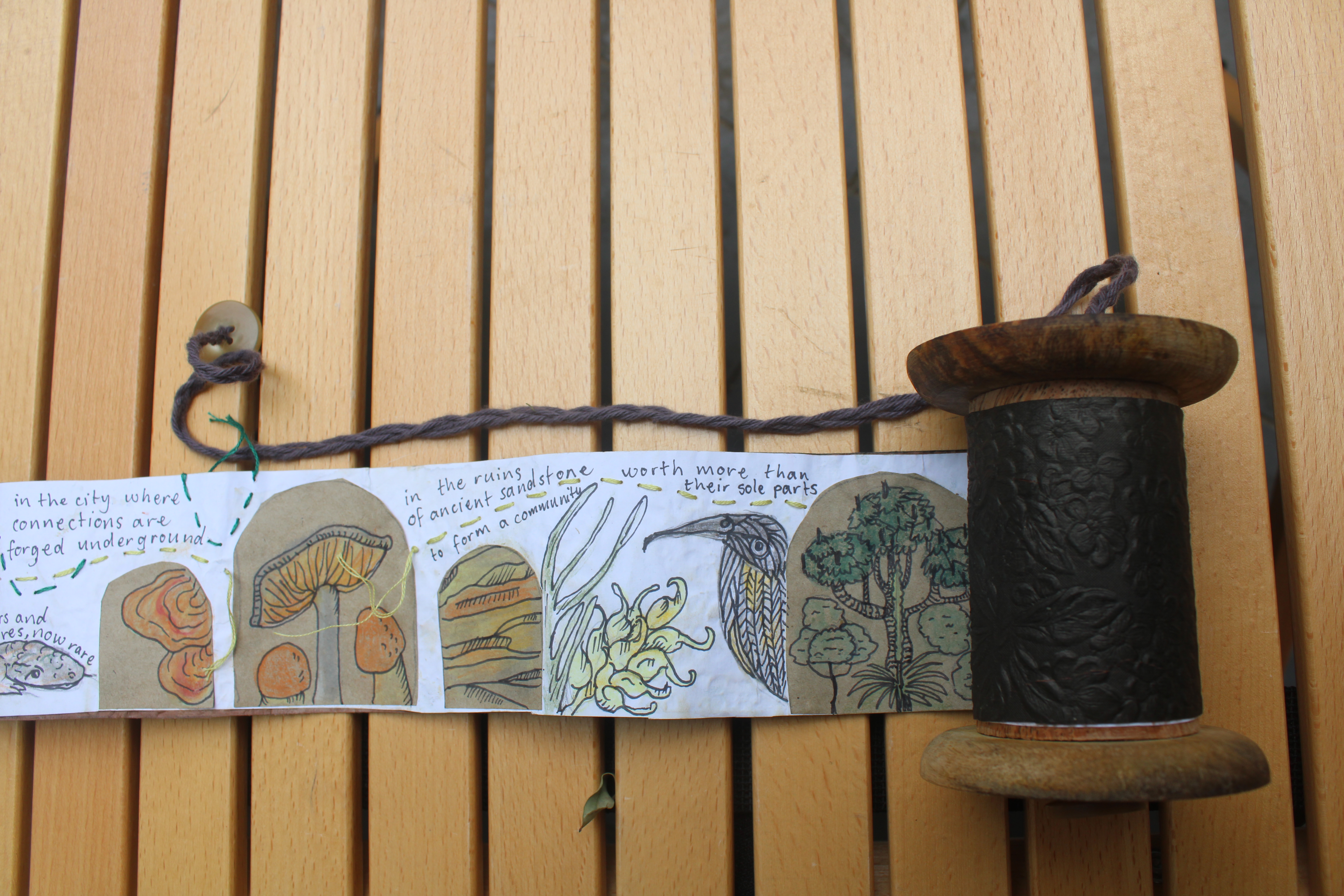 Eastern Suburbs Banksia Scrub is a community that I encounter a lot in my work, as I often work in the small remnant pockets of an ecosystem that once spread across the large sand dunes through the valleys of the swamps of Dharug and Dharawal Country. It is now critically endangered, as these sand dunes and swamps are now known as “Inner City Sydney”. Not good for ground dwelling plants and animals. I wanted to make a scroll that followed the dominant plants that make up the scrub (banksia and coastal tea tree), while showing that it is the community of plants, mycelium and animals that keep these areas alive.