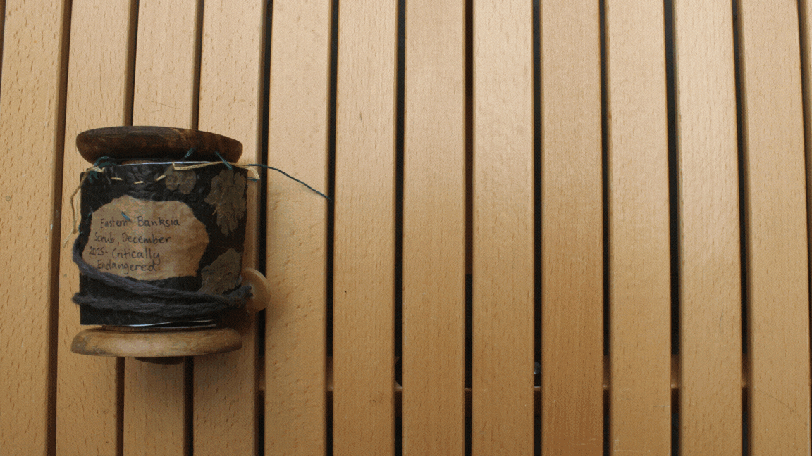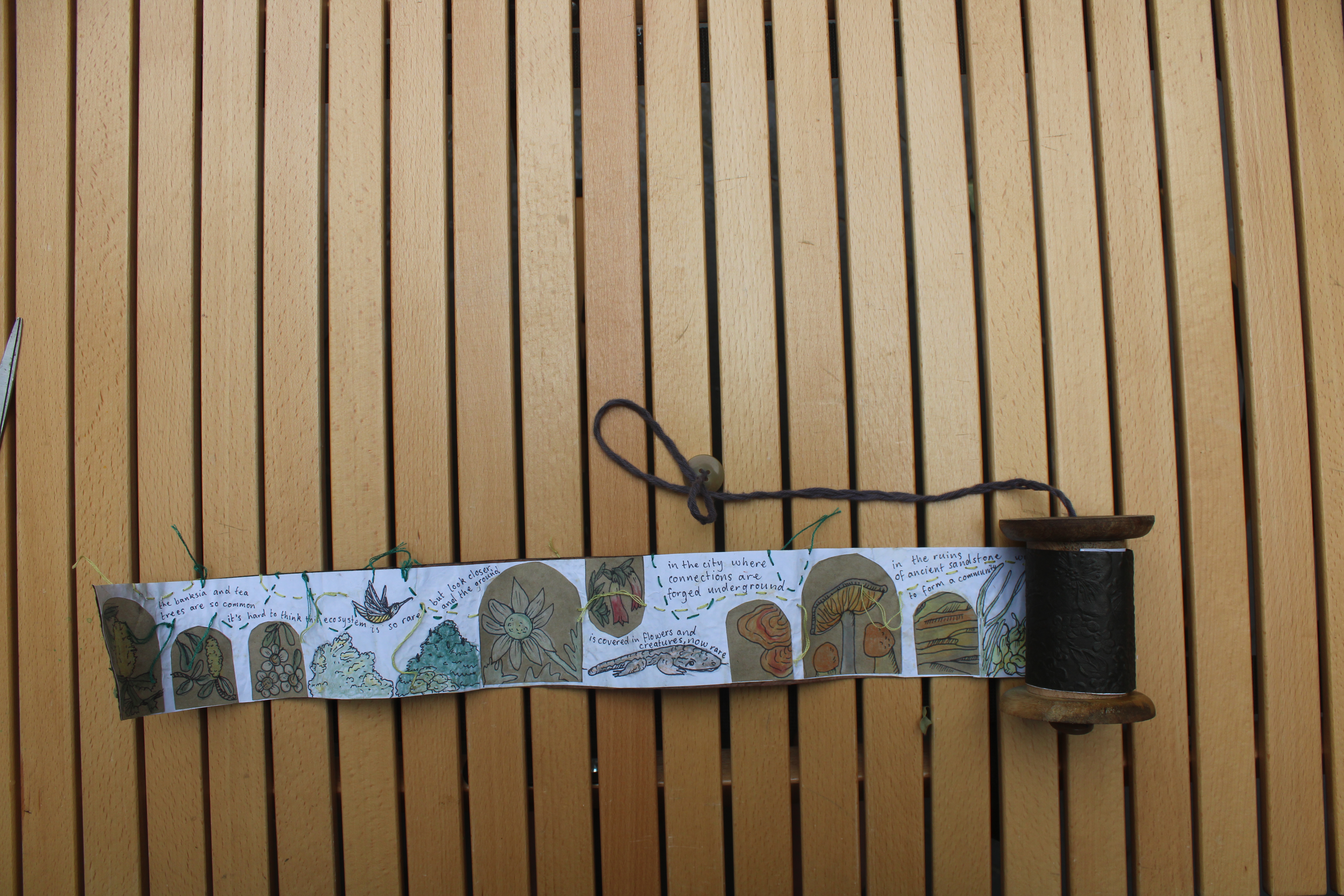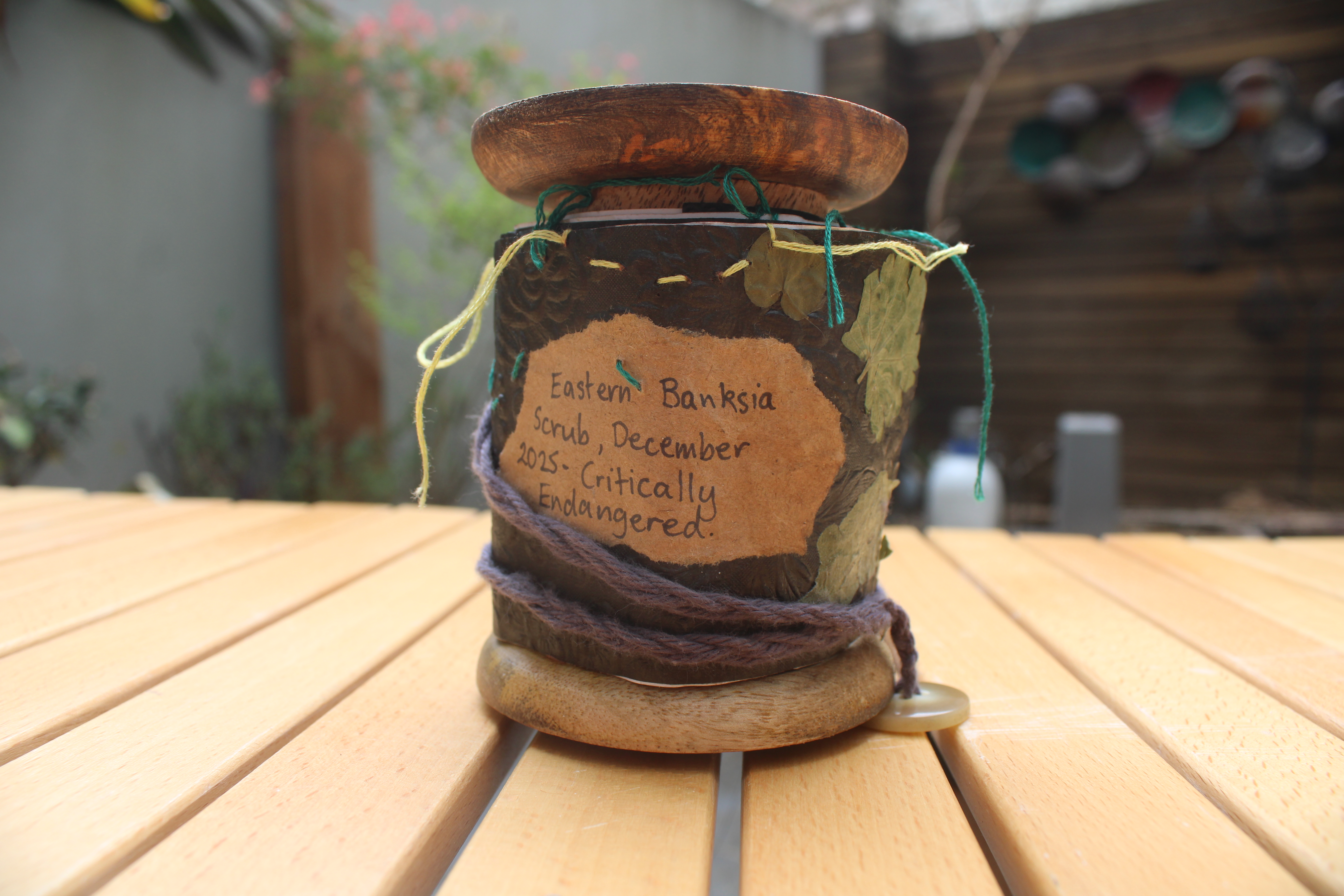 Eastern Suburbs Banksia Scrub is a community that I encounter a lot in my work, as I often work in the small remnant pockets of an ecosystem that once spread across the large sand dunes through the valleys of the swamps of Dharug and Dharawal Country. It is now critically endangered, as these sand dunes and swamps are now known as “Inner City Sydney”. Not good for ground dwelling plants and animals. I wanted to make a scroll that followed the dominant plants that make up the scrub (banksia and coastal tea tree), while showing that it is the community of plants, mycelium and animals that keep these areas alive.
